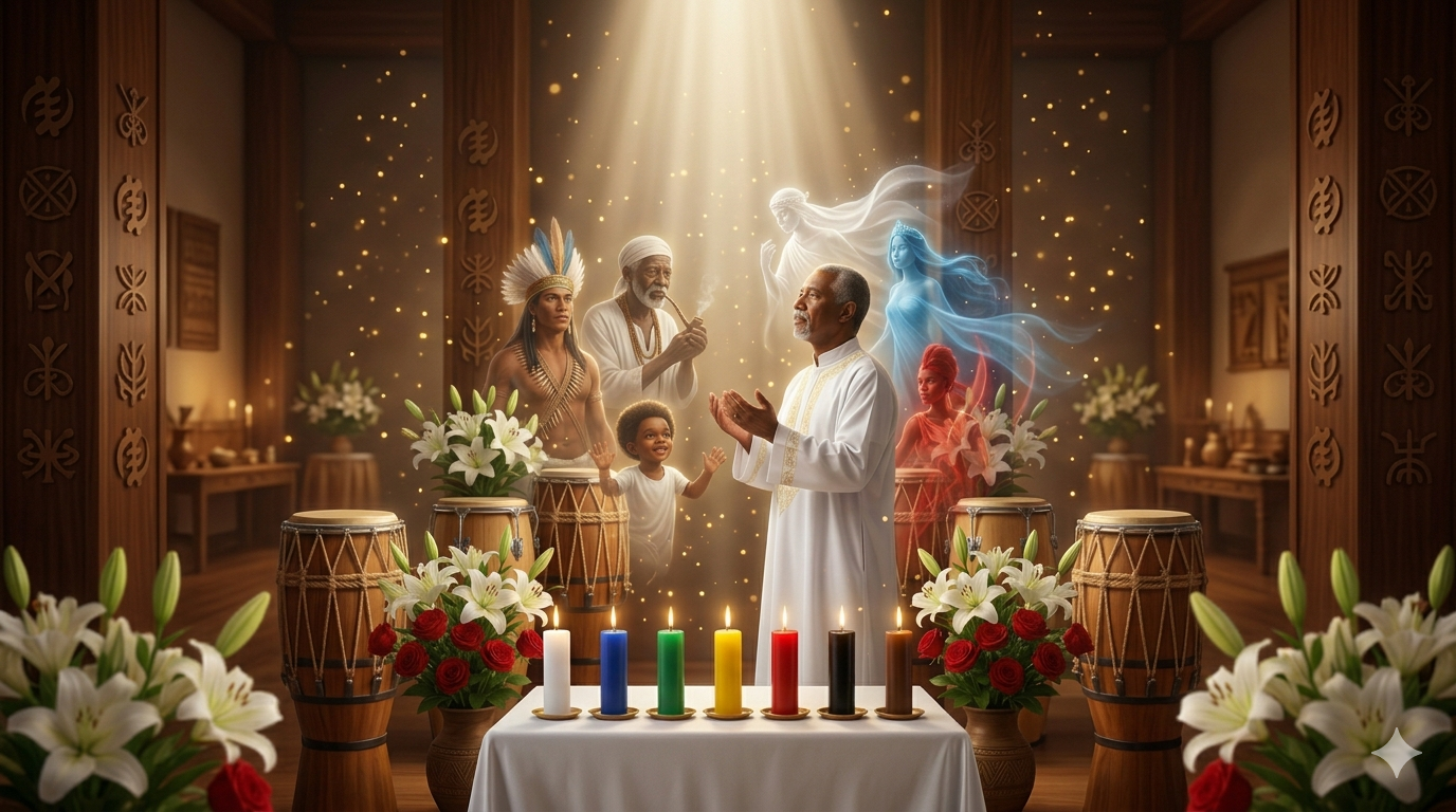"Recorrido antropológico y espiritual por la Umbanda brasileña: desde Zélio de Moraes hasta las corrientes contemporáneas. Exploración rigurosa de Orixás, entidades, jerarquías y rituales con fuentes académicas verificables."